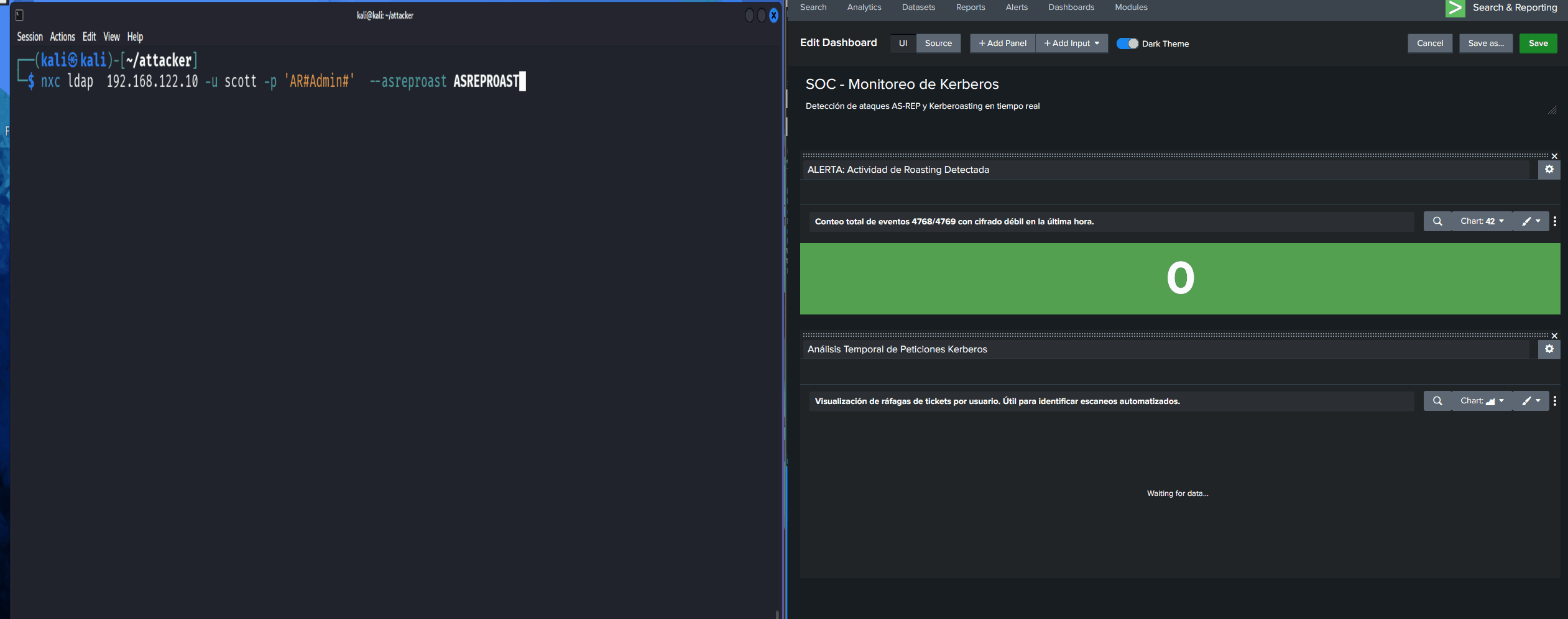 La Ventaja del Blue Team: Al enfrentar a un atacante (Kali/NetExec) contra nuestra defensa (Splunk), validamos que los Eventos 4768 y 4769 son las “huellas dactilares” irrefutables del compromiso. Entender el porqué de filtros como PreAuthType=0 o el uso de cifrado RC4 (0x17) nos separa de los analistas que solo copian y pegan comandos.